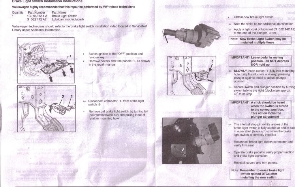 Con la nueva referencia 1C0 945 511 A RDW el procedimiento de instalación ha cambiado en un aspecto muy importante: no hay que mantener el freno pisado mientras se monta dicho interruptor, de hecho si lo hacemos quedará mal regulada la profundidad de pisada a la que encenderá las luces.